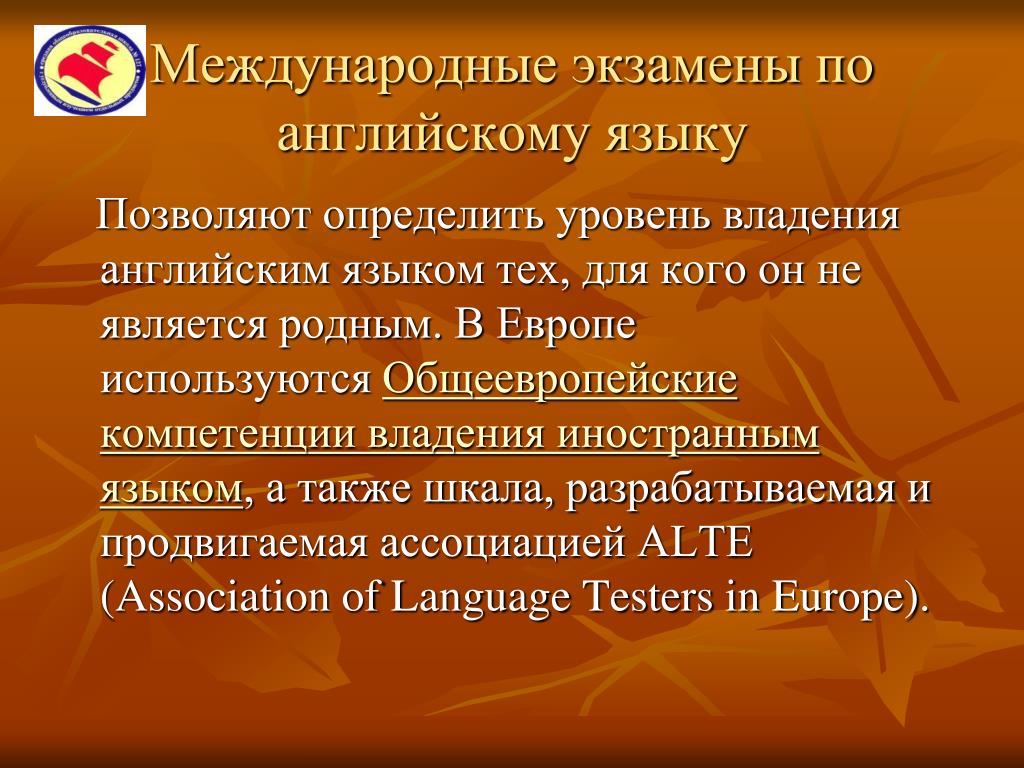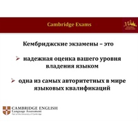 Согласитесь, очень приятно подкреплять свои знания не дипломом каких-либо неизвестных курсов английского языка, а сертификатом одного из международных экзаменов. Ведь в этом случае никто не сможет упрекнуть вас, так как ваш уровень этого языка был оценен не просто группой независимых лиц, а квалифицированными преподавателями и опытными профессорами выдающихся учебных заведений мира. - Каким бы ни был ваш первоначальный, так называемый «доэкзаменационный» уровень языка, он обязательно будет улучшен. Ведь для сдачи международных экзаменов требуется подготовка, которая может занять как пару месяцев, так и пару лет. Например, упорная работа над своими знаниями поможет сдать наивысшие экзамены Кембриджского университета CAE, CPE, получить высокие оценки на экзамене TOEFL или экзаменах на знание делового английского. Вывод: готовясь к сдаче международного экзамена, вы совершенствуете свой английский!