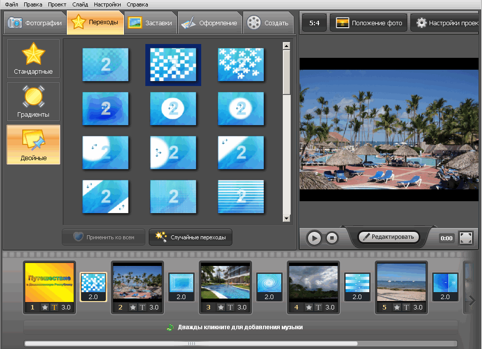 Вы можете добавить красивые переходы между фотографиями, а также музыку.