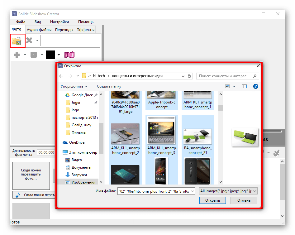 Выберите изображения, которые вы хотите добавить в слайд-шоу.