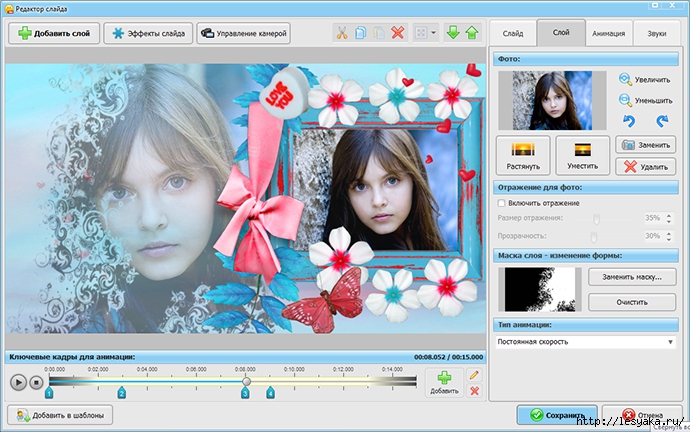 Наш редактор позволяет выбрать длительность показа не только готового слайда, но и каждого его фрагмента.