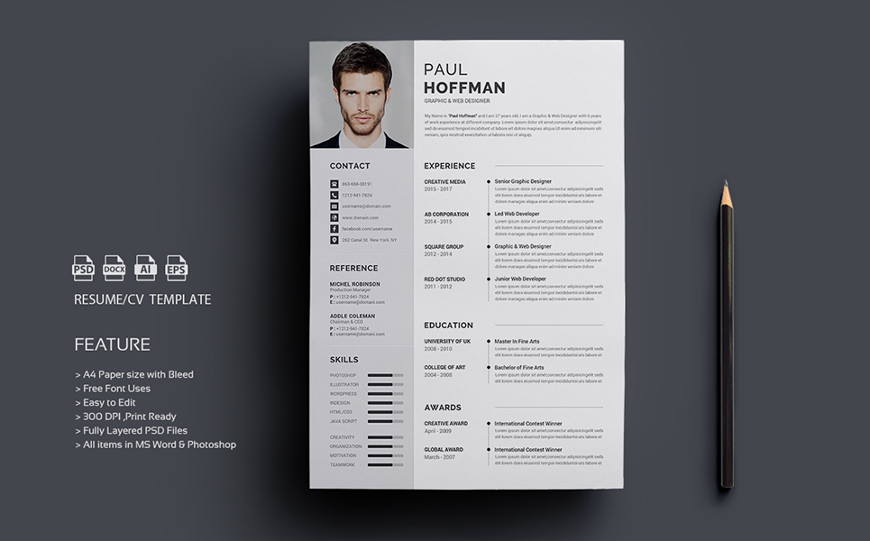 Этот шаблон резюме/шаблона резюме хорошо организован и структурирован. Изображения, текст и цвета полностью доступны для редактирования. Вы можете редактировать их быстро и легко. Все файлы очень хорошо организованы по слоям по именам и группам. Заполнители изображений — это смарт-объекты, упрощающие добавление изображений и редактирование файлов.