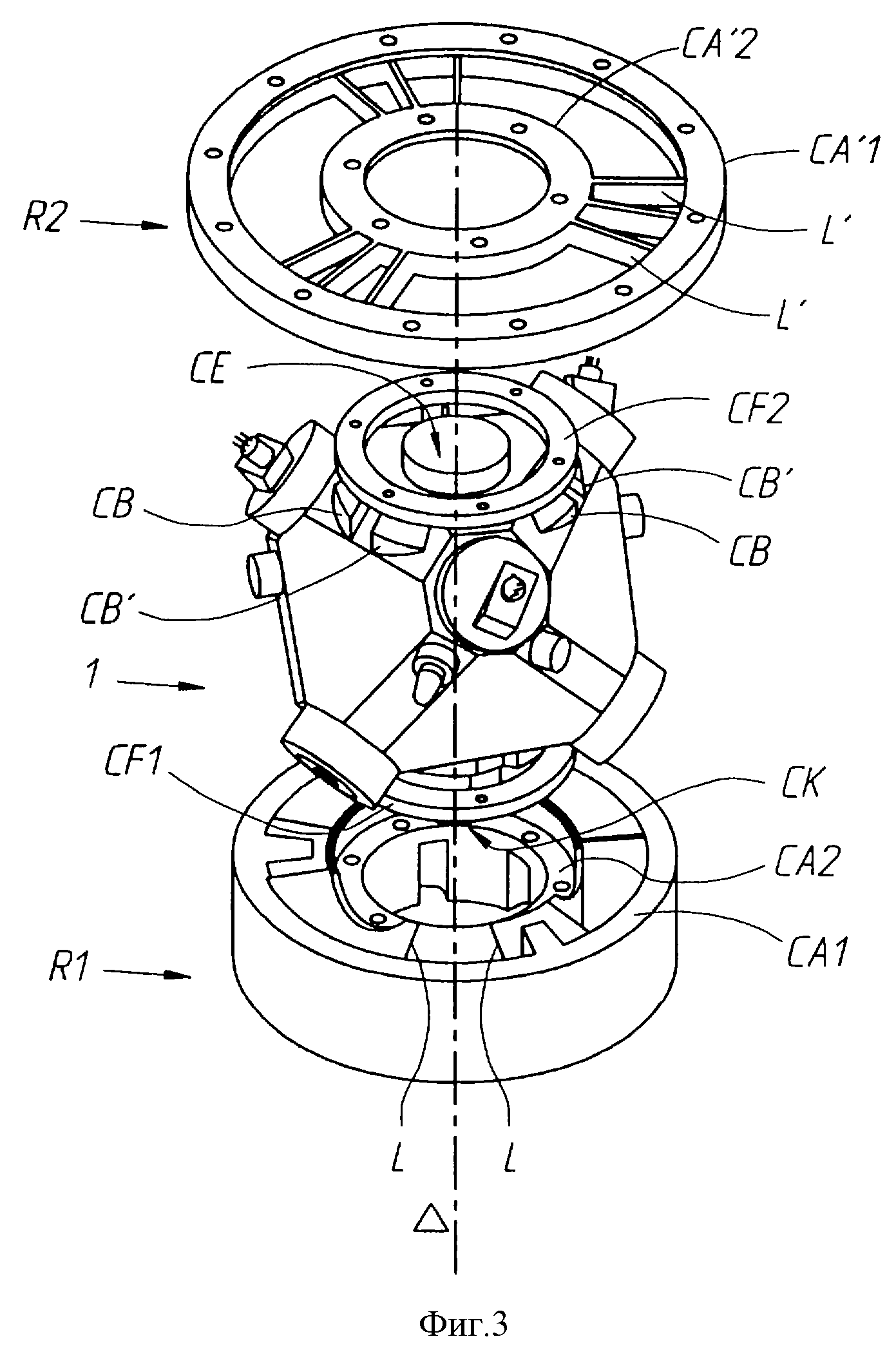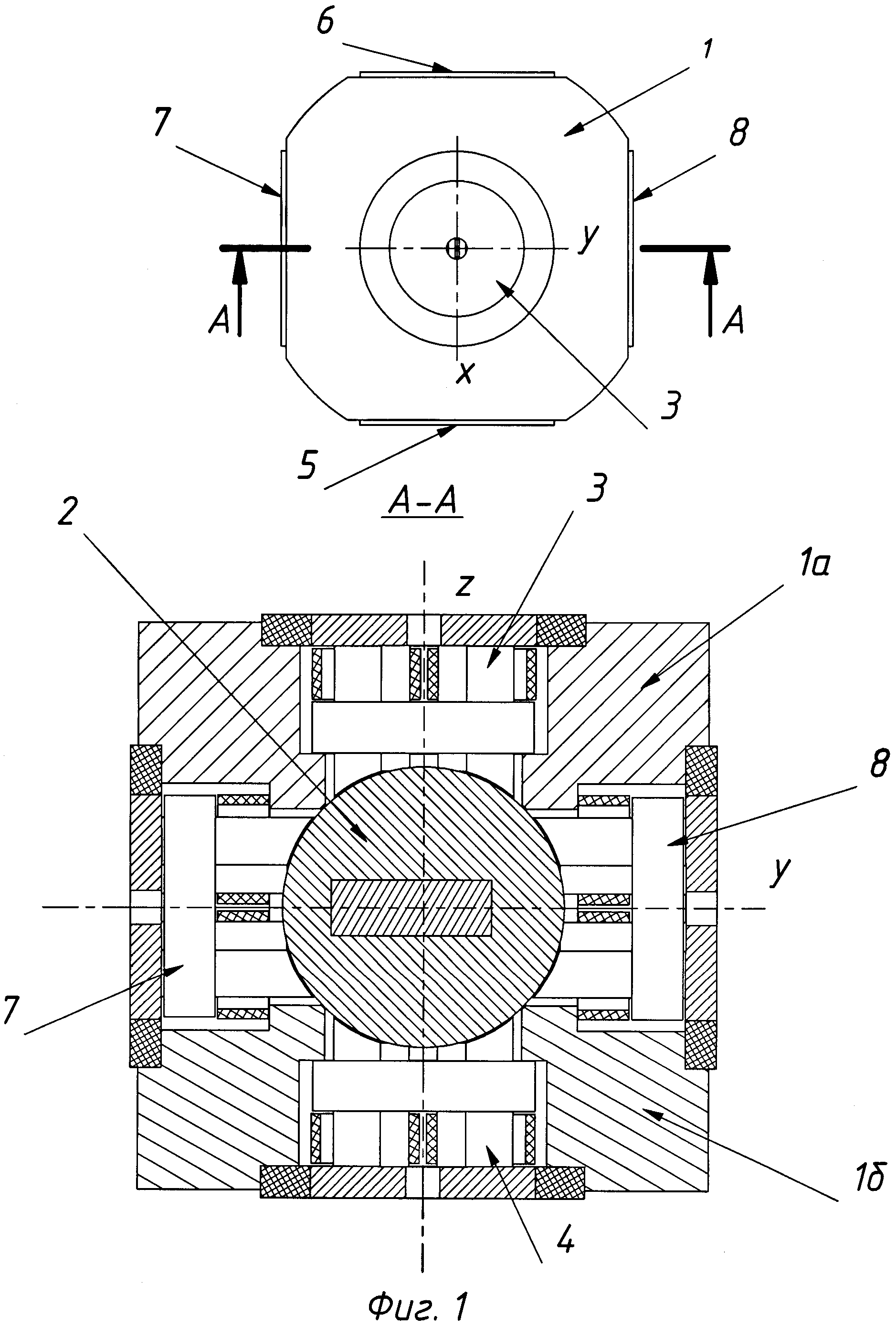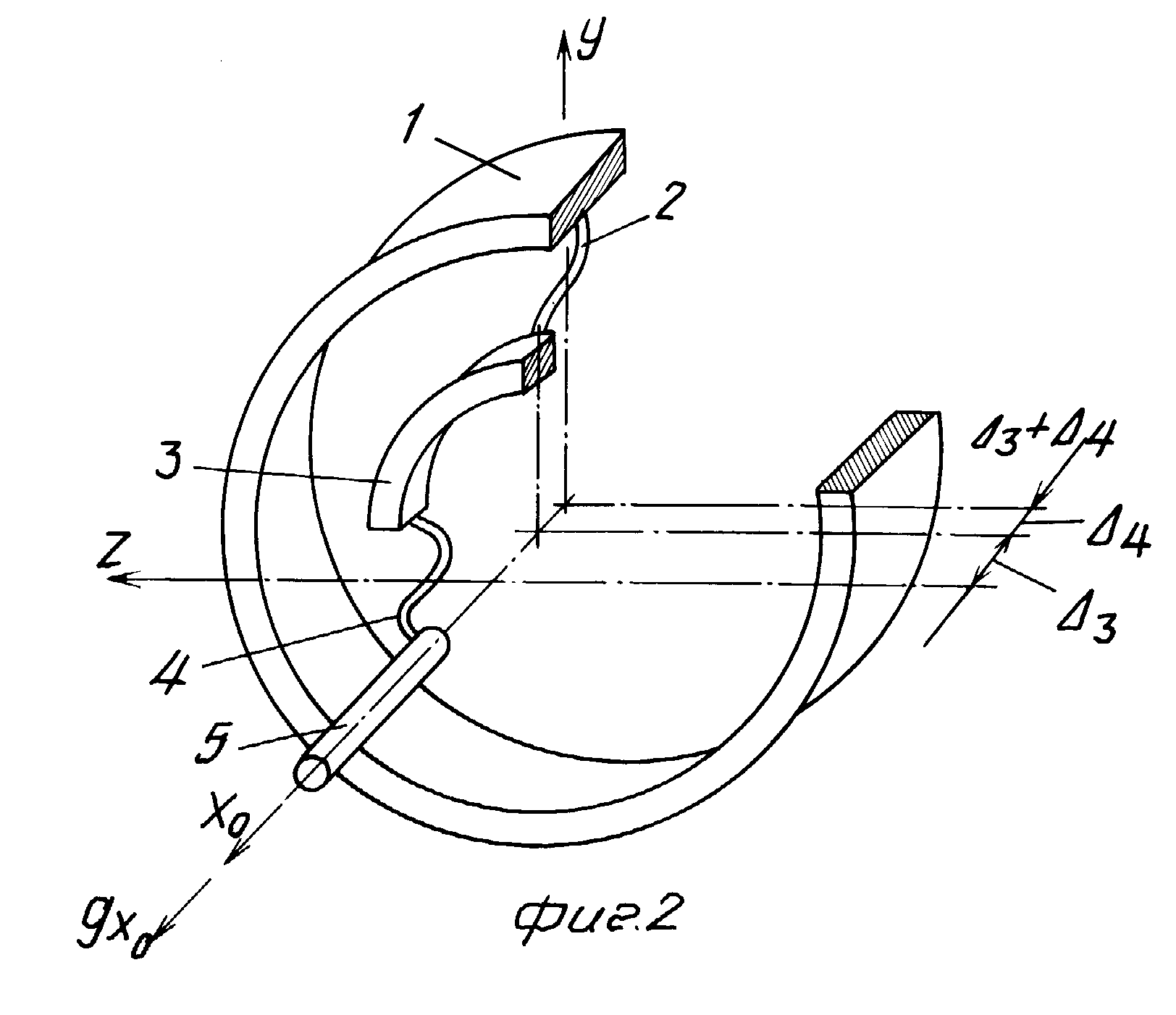 Внутренняя рамка 3 вместе с ротором поворачивается вокруг своей оси х относительно наружной рамки 2, а наружная рамка вместе с внутренней