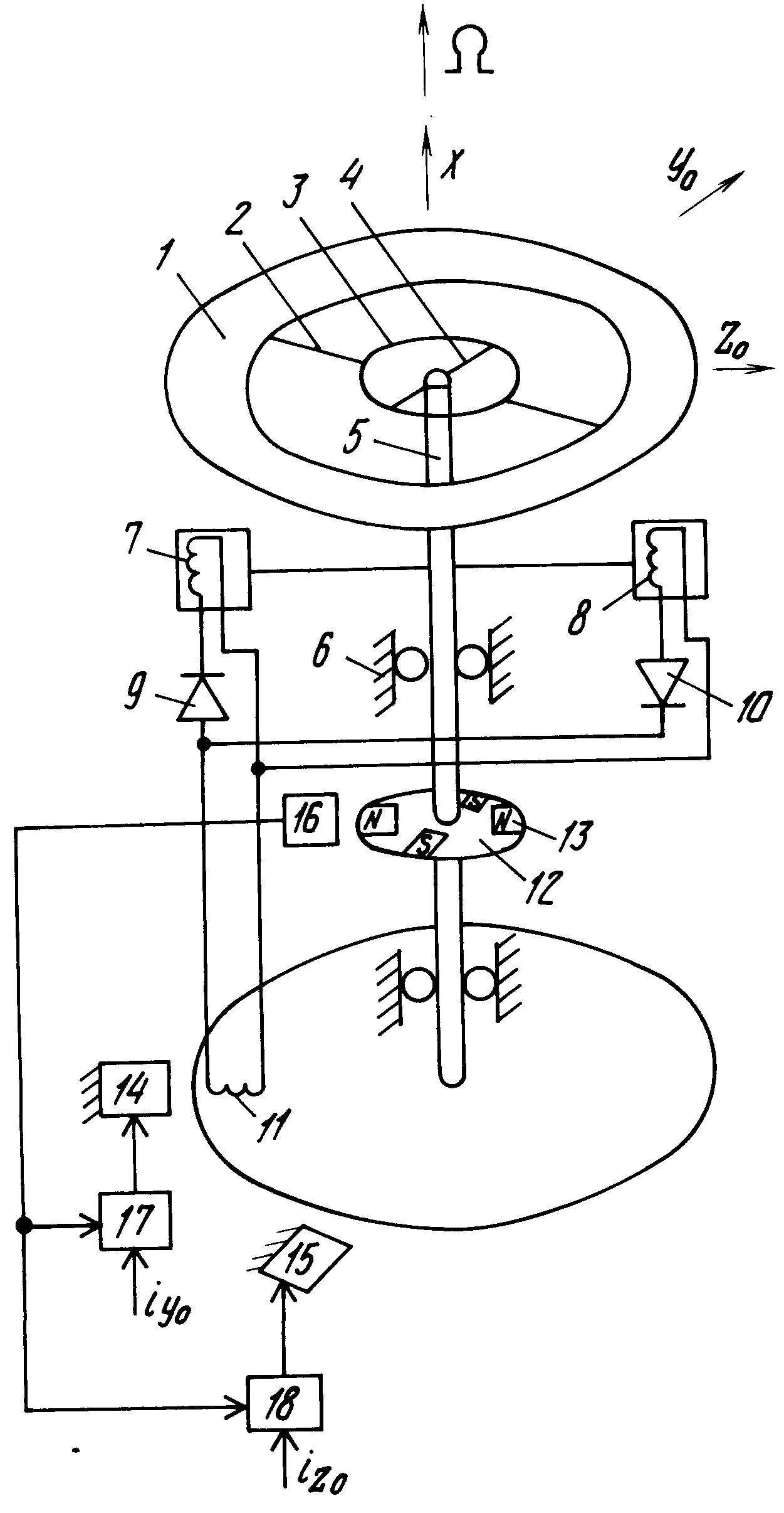 Ротор 8 гироскопа здесь так же, как и в случае гироскопа с обычным кардановым подвесом, имеет относительно основания три степени свободы вращение вокруг осей г/1 ж Xi.