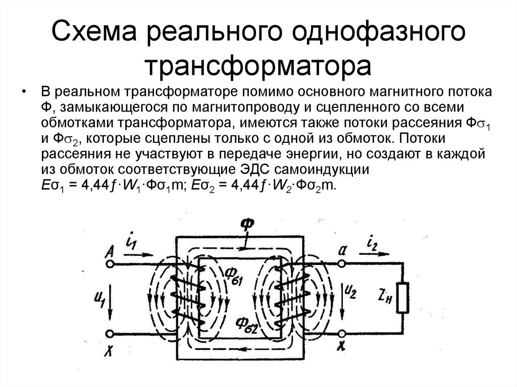 Первичная обмотка W1, при подключении к ней источника переменного напряжения U1, за счёт протекания тока I1 наводит в сердечнике из магнитопроводящего материала переменный магнитный поток Ф, который, в свою очередь, индуктирует в первичной и вторичной (W2) обмотках ЭДС Е1 и Е2. За счёт коэффициента трансформации (отношения ЭДС или количества витков первичной обмотки к вторичной) и эффекта магнитной индукции в обмотке W2 при подключении нагрузки Zн начинает протекать ток I2 . На нагрузке появляется напряжение U2 .
