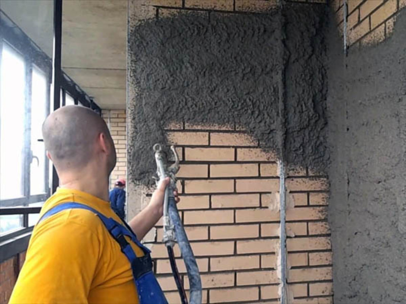Нанесение смеси, консистенция должна быть похожей на густую сметану. Если оштукатуривается бетонная поверхность, то слой должен быть около 5-7 мм, а если поверхность деревянная – 10 мм. Набирать смесь нужно с помощью мастерка и накидывать на стену. После 5-7 бросков, смесь на стене нужно разравнять и продолжить работать в таком же режиме. Далее поверхность должна высохнуть.
