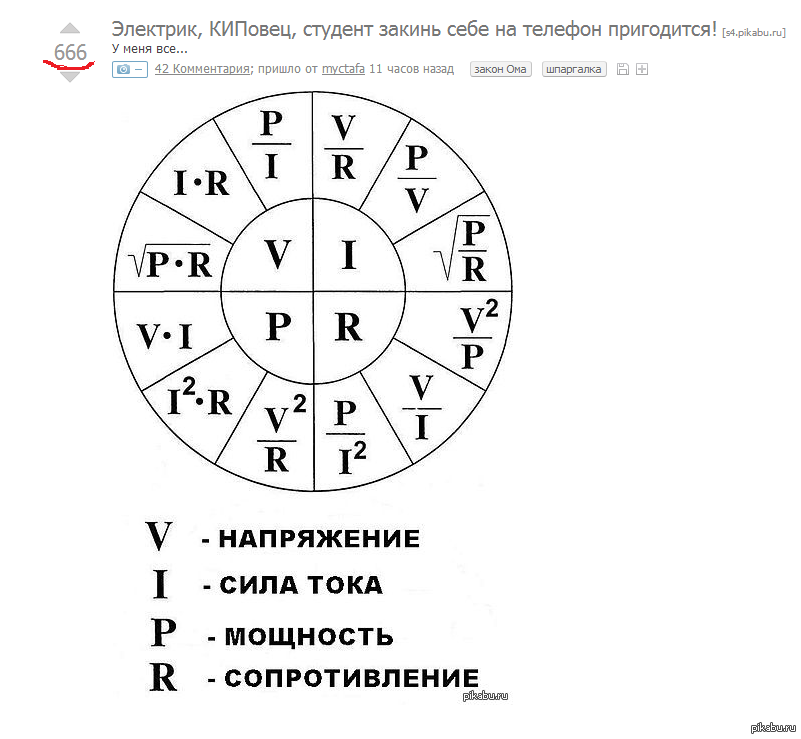 Правило использования диаграммы простое: достаточно закрыть искомую величину и два других символа дадут формулу для её вычисления. Например.