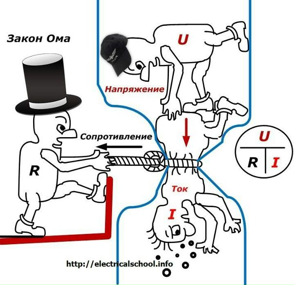 Вольт пытается протолкнуть Ампер через сечение проводника(сила тока прямо пропорциональна напряжению), а Ом наоборот – мешает этому (и обратно пропорциональна сопротивлению). И чем сильнее Ом «стягивает» проводник, тем тяжелее Амперу будет пролезть. Но если Вольт посильнее пнёт…