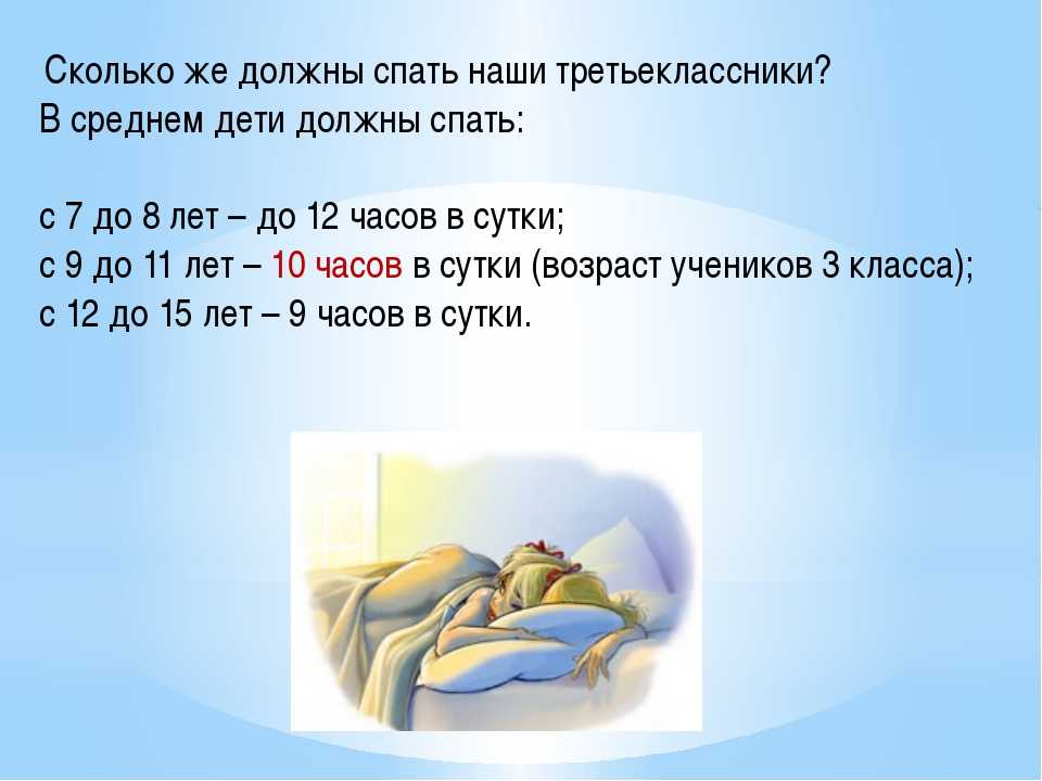 Национальный фонд сна сообщает, что потребности во сне различаются для разных возрастных групп. В то время как взрослым требуется от семи до девяти часов, новорожденным — от 14 до 17 часов, дошкольникам — от 10 до 13 часов, а подросткам — от 8 до 10.