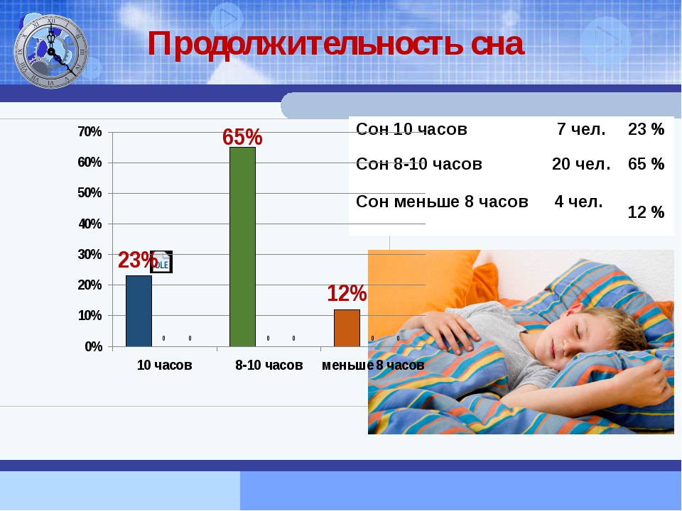 У нас на классном часе рассказывали, сколько надо спать школьникам. Оказывается, что в разном возрасте нормы количества часов сна отличаются. Так с 7 до 9 лет сон должен составлять 10-11 часов. И еще 1-2 часа дополнительный сон днем. С 10 до 12 лет на сон отводится 10,5 часа.
