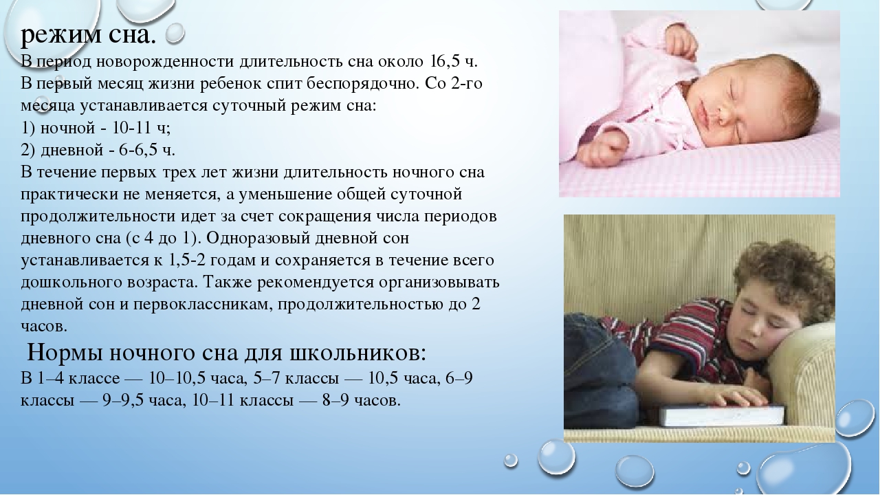 Итак, в 1 – 4 классе ребенку необходимо спать 10 – 10,5 часа, в 5 – 7 классе — 9,5 – 10 часов, в 6 – 9 классе — 9 – 9,5 часа, в 10 – 11 классе — 8 – 9 часов. Первоклассникам рекомендуется организовывать дневной сон продолжительностью до 2 часов.