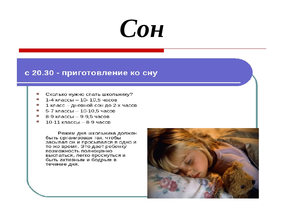 Наибольшее влияние на состояние здоровья школьника оказывает количество и качество сна, питание и двигательная активность. Ребенку необходимо удовлетворять соответствующую возрасту потребность во сне, потому что в противном случае создаются условия для возникновения заболеваний. Школьникам показано увеличивать обычную продолжительность сна (хотя бы на 1 час) на время экзамена, перед контрольными работами и при всякой напряженной умственной деятельности. У детей, недосыпающих 2-2,5 часа, уровень работоспособности на уроках снижается на 30%.