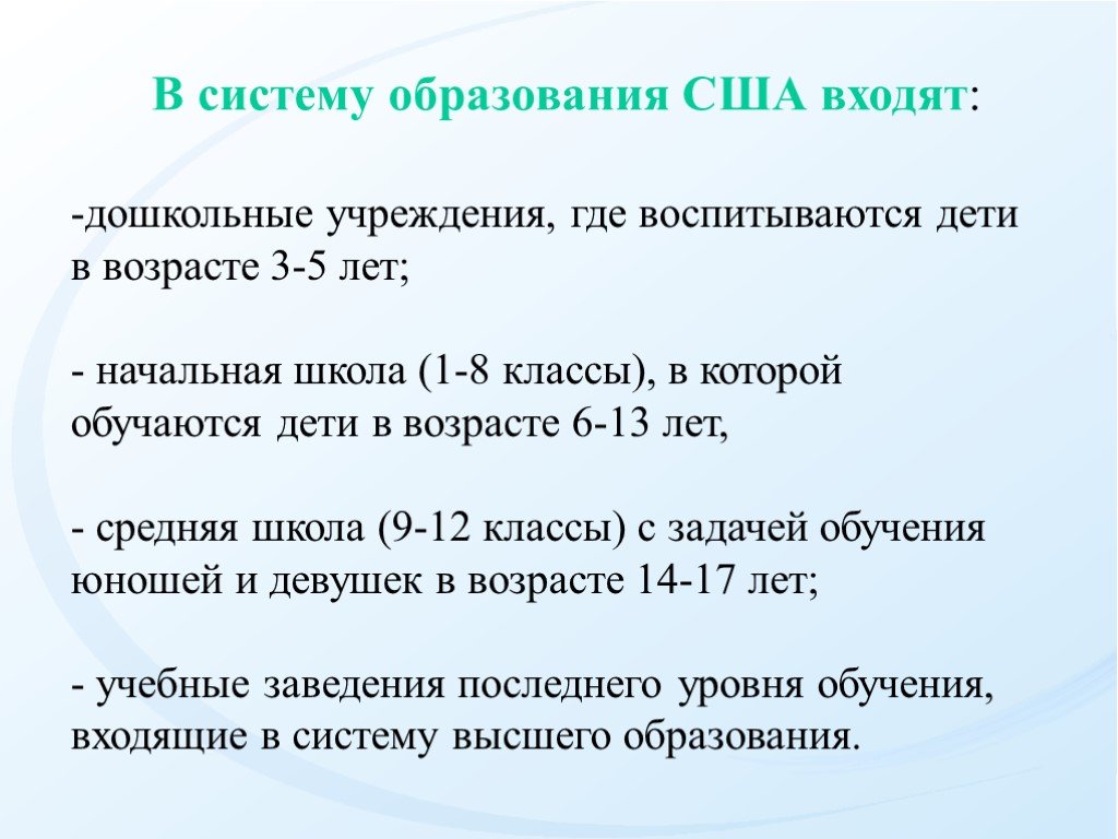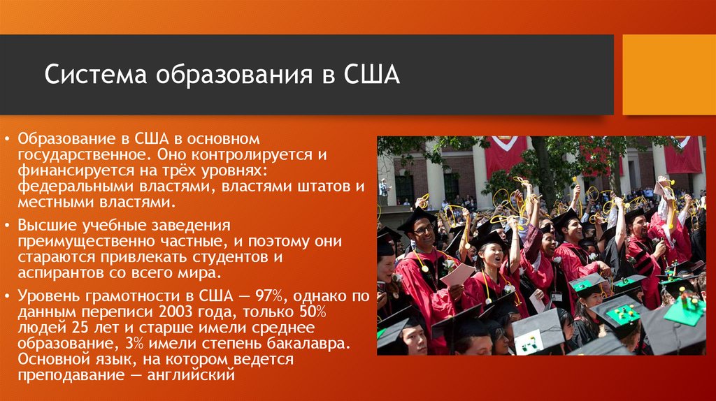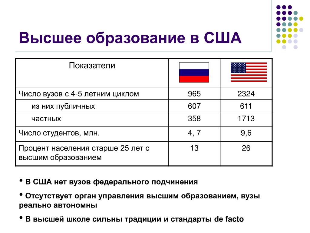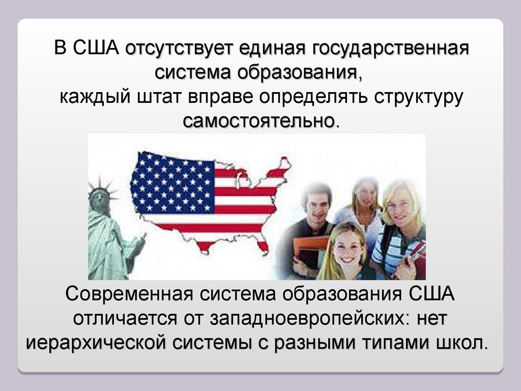 Университеты США задают мировые образовательные стандарты по многим направлениям обучения. Легендарные университеты Лиги Плюща (Ivy League) стали классикой элитного образования, за ними в последние годы подтянулись ведущие университеты Калифорнии, такие как Стэнфордский университет (Stanford University) и Калифорнийский технологический институт (Caltech). При этом американское школьное образование существенно отличается от стандартов, к которым мы привыкли в России.