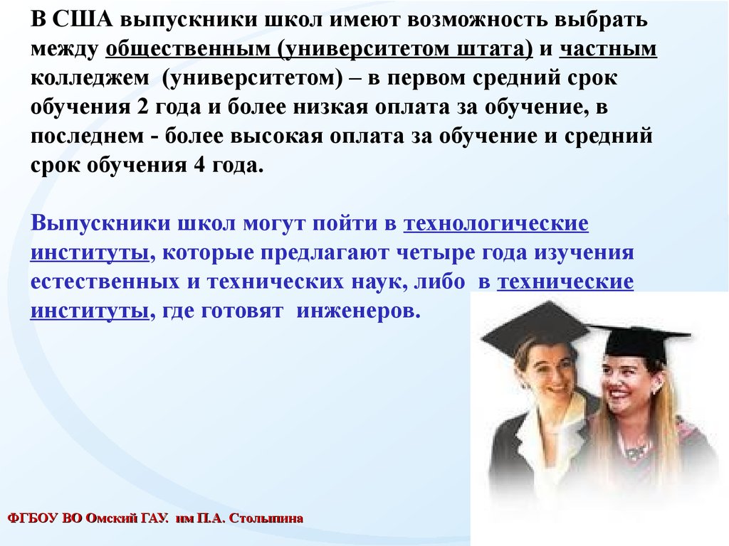 Высшие учебные заведения в США включают в себя колледжи и университеты. Колледжи предоставляют только четырехгодичные программы бакалавриата. Кроме того, в Америке существуют государственные Community Colleges с двухгодичными программами. Они позволяют значительно сэкономить на первых двух курсах бакалавриата, а затем без экзаменов перевестись в учиться в колледже с четырехгодичными программами или в университет сразу на третий курс. Выпускники Community Colleges получают степень AA (Associate of Arts) или AS (Associate of Science).