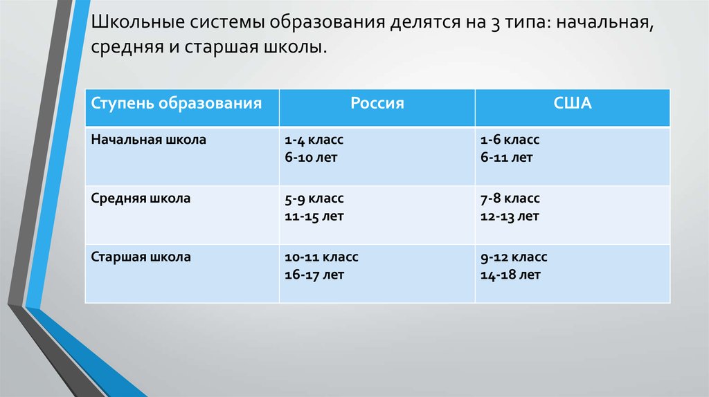 Оно делится на три блока: начальное, среднее, высшее. Как правило, блоки не номинальны — это три разные школы. После окончания каждого из них ученики поступают в другую школу на следующий уровень. Особенно важным для дальнейшего образовательного трека является выбор именно высшего звена средней школы (High School).