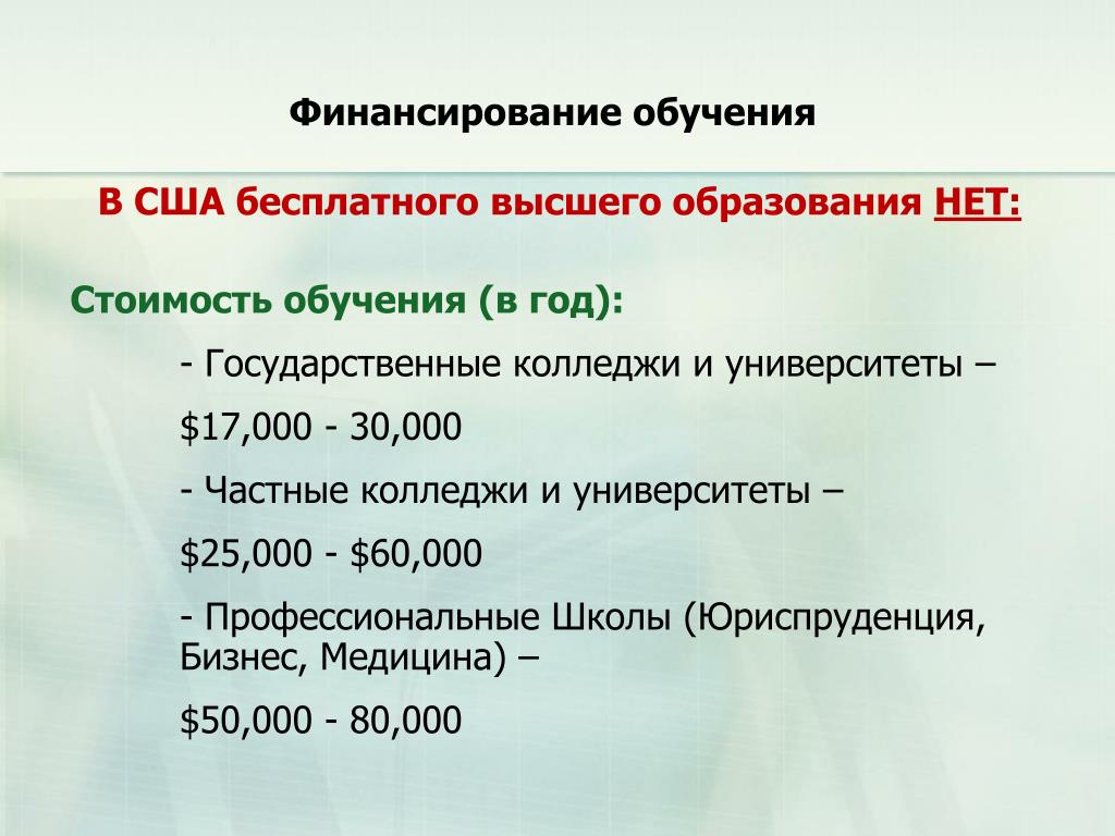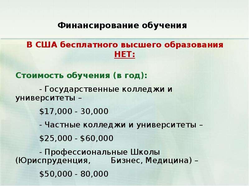 Высшее образование в США платное. Его стоимость высока, однако у самых успешных студентов есть возможность получить финансовую поддержку от вуза. Иногда такая финансовая помощь покрывает лишь часть расходов, а иногда полностью оплачивает обучение. Кроме того, существуют фонды, которые выдают гранты на получение высшего образования в Америке. Подать заявку на подобный грант могут в том числе и иностранные абитуриенты.