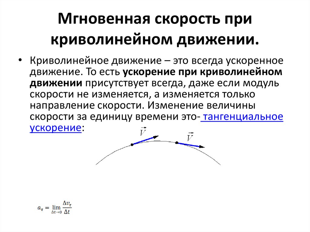 Здесь v — модуль скорости, — направленный вдоль скорости единичный вектор касательной к траектории в точке .