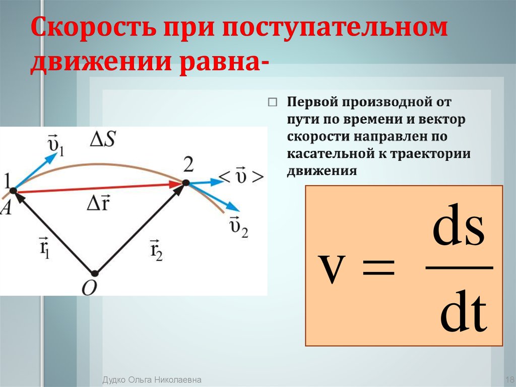Направление вектора υ идет по касательной к криволинейной траектории, потому как бесконечно малое перемещение dr совпадает с бесконечно малым элементом траектории ds.