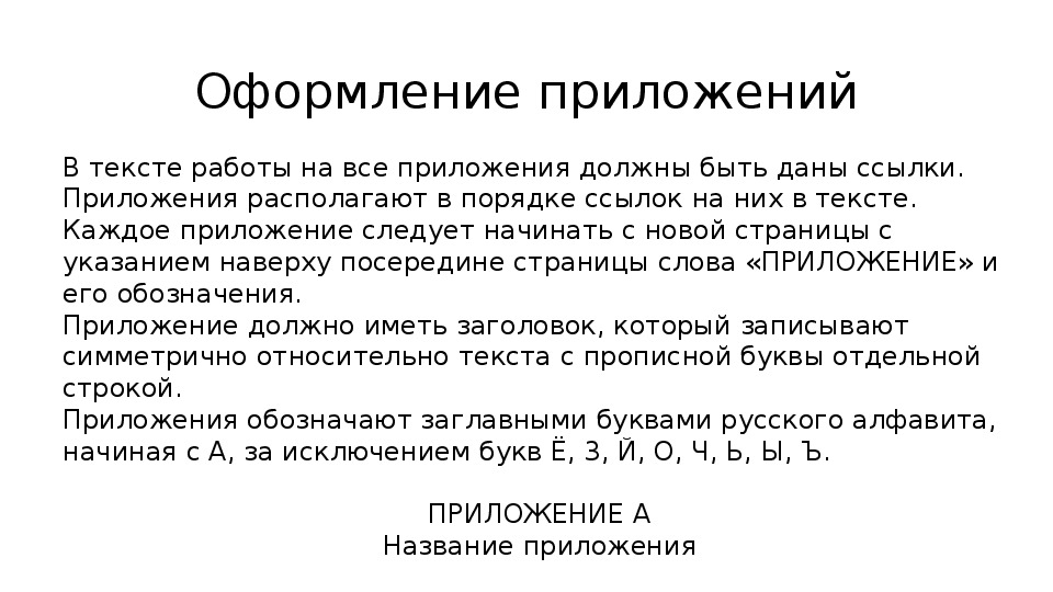 Название приложения может быть в том же формате, что и заголовок других разделов вашей исследовательской работы или презентации. Вы можете написать его тем же шрифтом и размером. Он также может быть написан заглавными буквами, например, ПРИЛОЖЕНИЕ, или в заголовке или в предложении, например, Приложение.