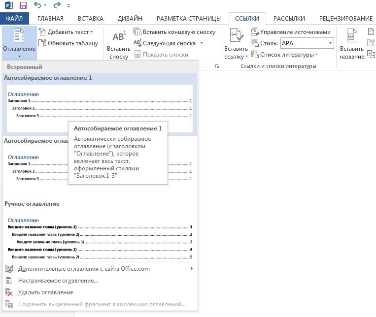 - Появится выпадающий список, в котором выбираем нужное, например, Автособираемое оглавление 1.