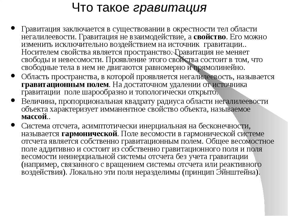 Поскольку гравитация относится к прямому взаимодействию тел, то и определяется она Законом всемирного тяготения. Гравитационному полю придан условный характер, необходимый лишь для расчётов. Для земных условий это вполне допустимо.