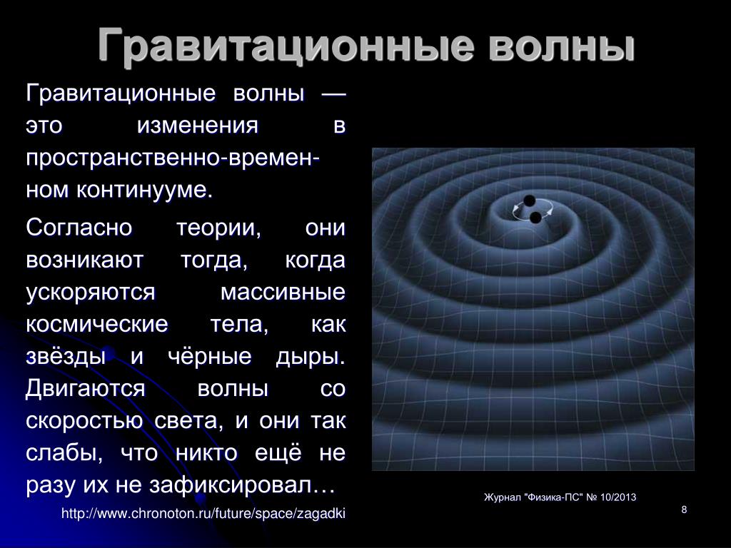Гравитационное излучение или гравитационная волна – термин, впервые введенный в физику и космологии известным ученым Альбертом Эйнштейном. Гравитационное излучение в теории гравитации порождается движением материальных объектов с переменным ускорением.