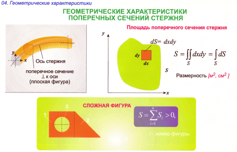 При расчете элементов конструкций на прочность, жесткость и устойчивость приходится кроме общеизвестной характеристики – площади поперечного сечения A, оперировать такими геометрическими характеристиками сечений, как статический момент площади, момент инерции, момент сопротивления, радиус инерции.
