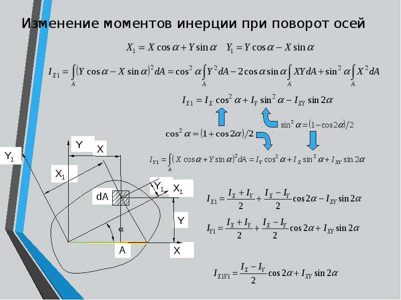 IX0 = Ix*cos2(α) + Iy*sin2(α) – Ixy*sin(2*α) =