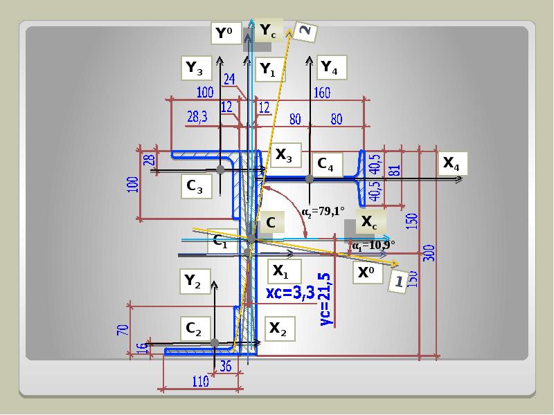 Главные оси, проходящие через центр тяжести сечения, называют главными центральными осями, а соответствующие им моменты инерции – главными центральными моментами инерции.