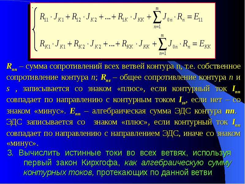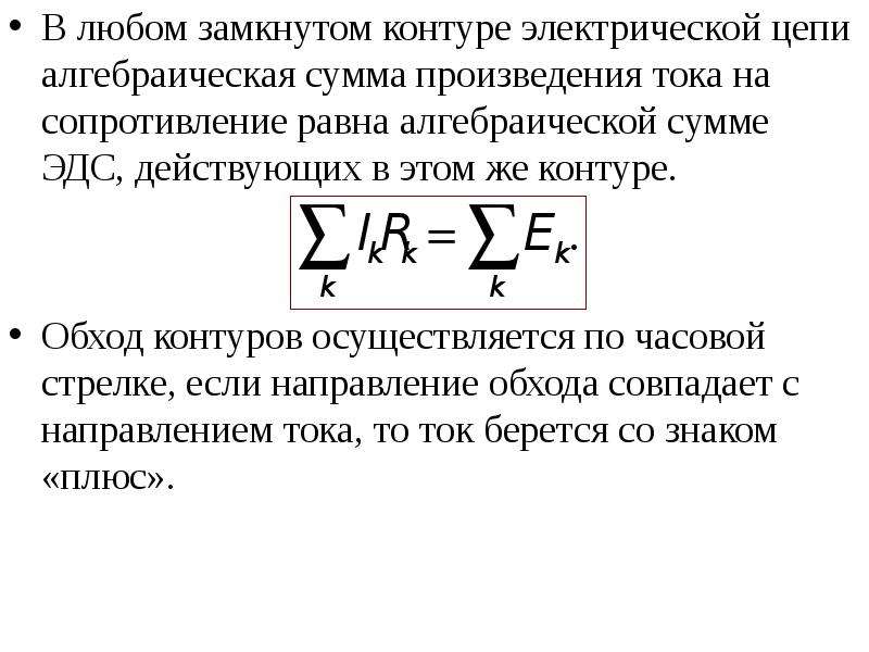 Ответ: Правило петли Кирхгофа гласит, что сумма разностей напряжений вокруг петли должна быть равна нулю.Чтобы найти сумму, нужно выбрать направление движения. Направление положительного тока задается против часовой стрелки, поэтому его проще всего использовать в качестве направления движения, чтобы найти сумму. Источник напряжения или батарея слева на рисунке имеет положительное значение напряжения в направлении против часовой стрелки. Три резистора вызывают падение напряжения в этом направлении. Величина падений напряжения равна сопротивлению, умноженному на ток в контуре, поэтому их сумма должна быть той же величины, что и напряжение от батареи.Сумма разностей напряжений в выбранном направлении движения составляет: