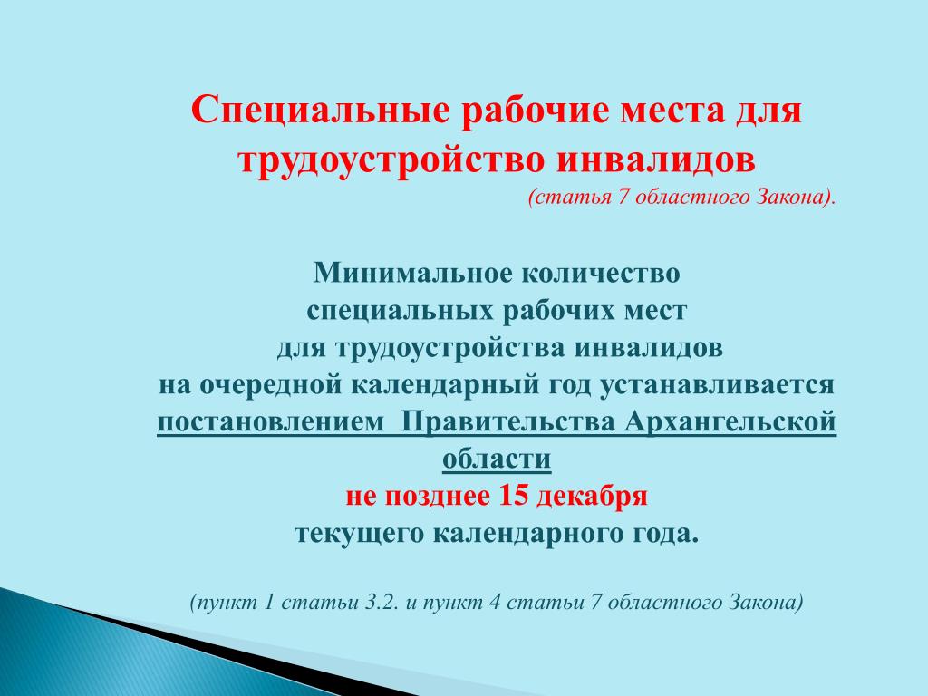 - установления в организациях независимо от организационно-правовых форм и форм собственности квоты для приема на работу инвалидов и минимального количества специальных рабочих мест для инвалидов;