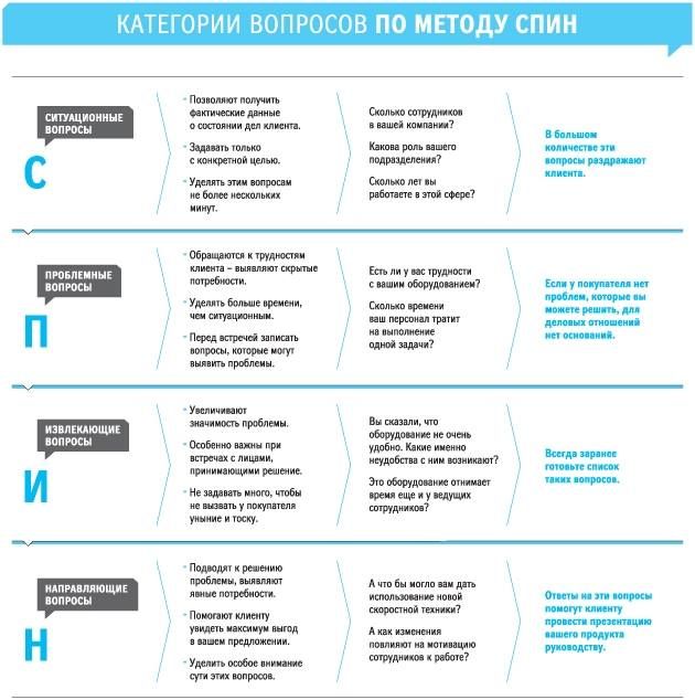 Понятие СПИН (SPIN) является очередной аббревиатурой четырех типов вопросов, на основе которых строится цепочка коммуникаций с клиентом. SPIN — с английского переводится как «штопор».