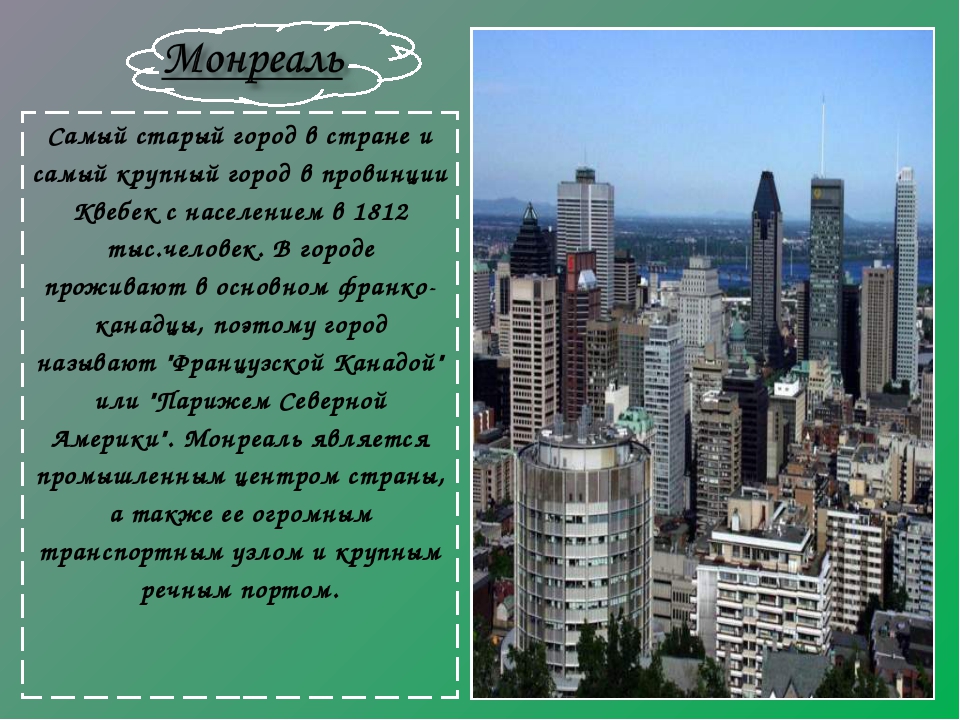 В планировке города удачно использованы естественные террасы, ступенями поднимающиеся от берега реки к вершине холма. На нижней террасе разместились портовые сооружения и промышленные предприятия, на средней — административные здания и торговые центры, а верхняя терраса использована под жилую застройку. На вершине холма водружен 33-метровый иллюминированный крест, символизирующий католическую веру. Большинство населения Монреаля — франко-канадцы, и в облике города ясно прослеживается европейский стиль. Здесь можно встретить и уменьшенные копии известных архитектурных памятников Европы, например парижского собора Нотр-Дам. В городе насчитывается более 350 парков, около 300 церквей, 15 мостов. Знаменитый мост Жак-Картье через реку Св. Лаврентия имеет длину почти 4,5 км. В Монреале сосредоточено много культурных учреждений, в том числе крупнейший франко-канадский университет. После создания глубоководного пути по реке Св.