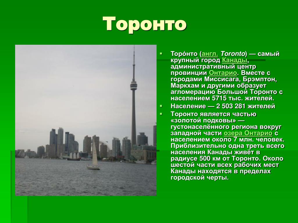 Крупнейший город Канады (население — около 3,9 млн жителей) раскинулся на прибрежной равнине озера Онтарио, где пересекаются старые и современные водные и сухопутные пути, стремящиеся к району Великих озер. Само название города на языке местных индейцев означает «место встреч».