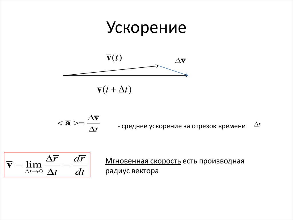 Чем больше промежуток времени Δt, тем средняя скорость больше отличается от мгновенной. И, наоборот, чем меньше промежуток времени, тем меньше средняя скорость отличается от интересующей нас мгновенной скорости.