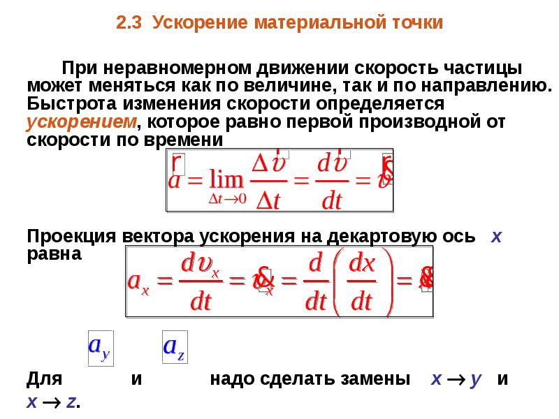 Ускорение (символ: а) определяется как скорость изменения скорости.Таким образом, это векторная величина с размерностью длина / время². В единицах СИ ускорение измеряется в метрах в секунду².