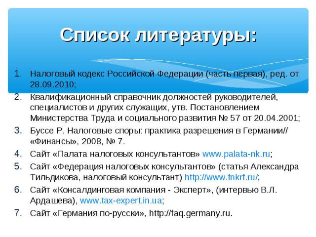 Официальные документы ставятся в начале списка в определенном порядке: Конституции; Кодексы; Законы; Указы Президента; Постановление Правительства; другие нормативные акты (письма, приказы и т.