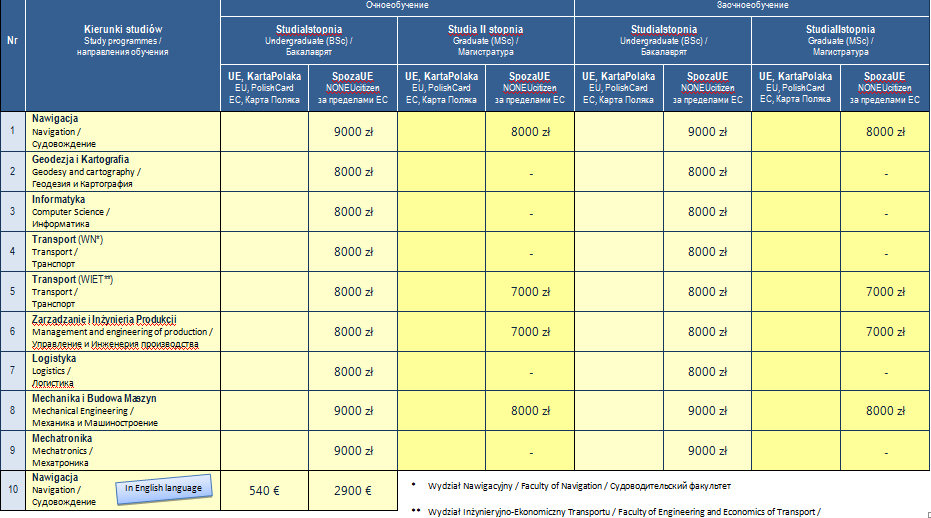 | Направление | Стоимость за семестр, злотых |
