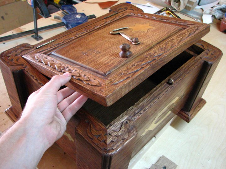 Этот дубовый сундук, как мы и ожидали, является типичным произведением, которое до промышленной революции производили городские столяры.