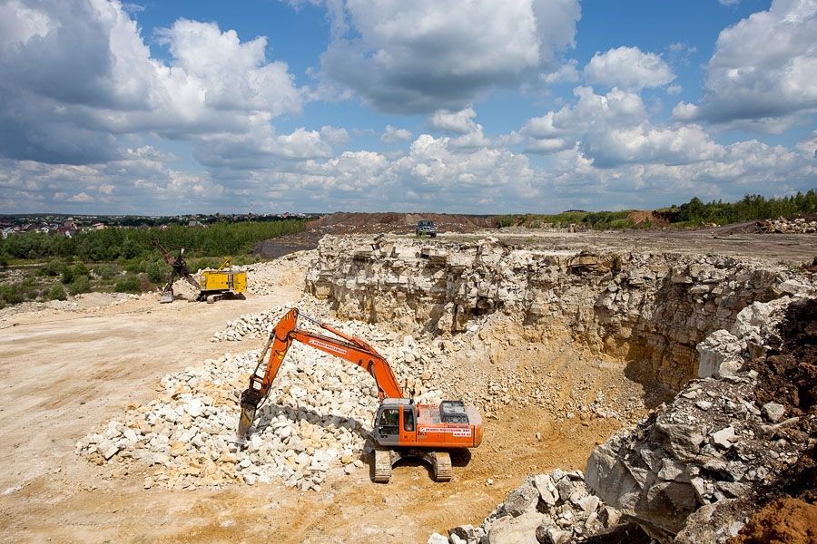 Грузовики загружают валунами, которые укрепят узкую косу, ведущую к тому, что будет основным пролетом моста.