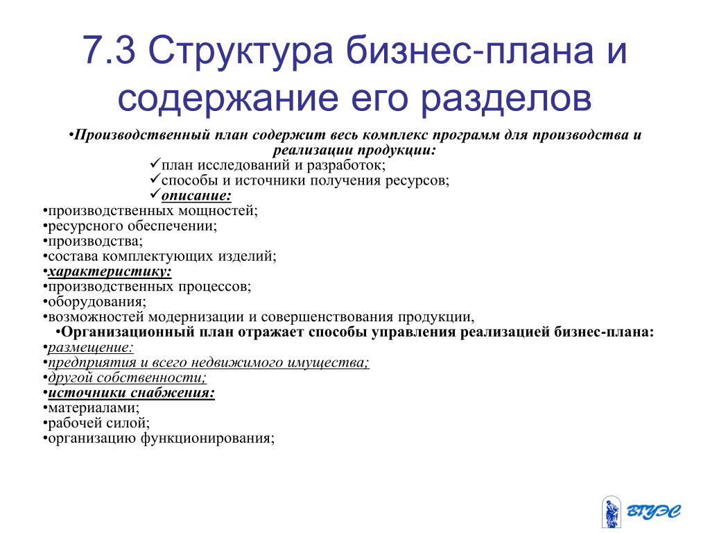 Большой круг вопросов, которые определяются в бизнес-плане, посвящены производству продуктов и услуг и технологическим процессам. В производственном плане должны содержаться ответы на следующие вопросы: