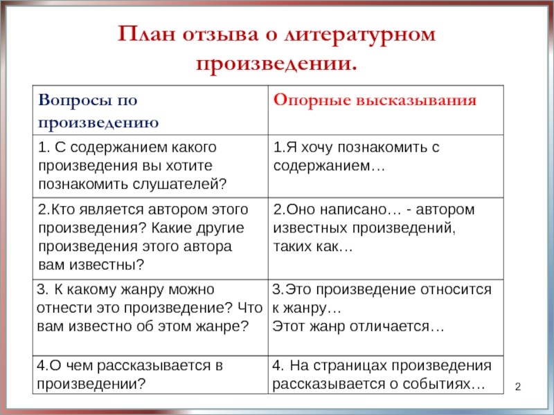 Правильно-составленная рецензия состоит из пяти основных частей. Примерное содержание текста, указанное ниже, облегчит составление этой работы.