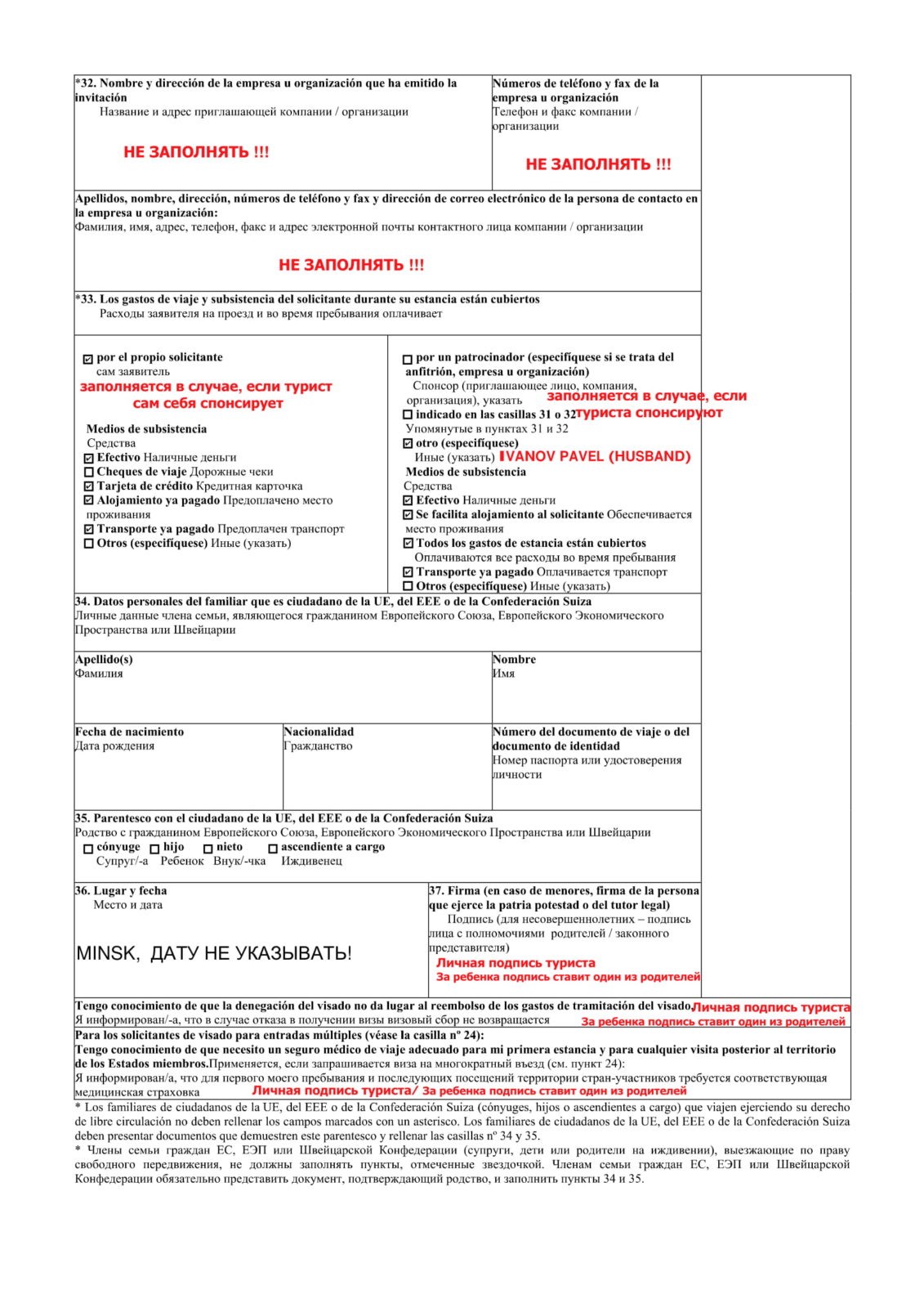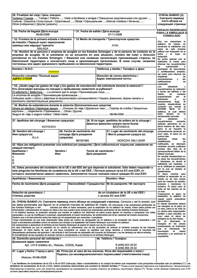 - Анкета 2 экземпляра, заполненная на английском или испанском языке. Анкета должна быть подписана заявителем, за несовершеннолетних детей анкеты подписывают родители.