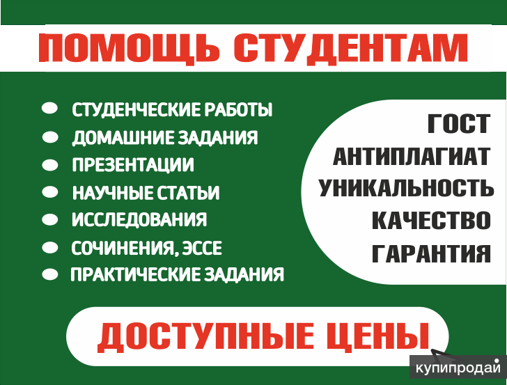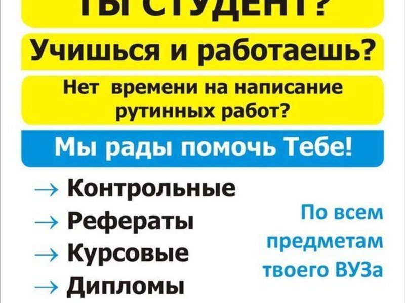 Выполнение студенческих работ — процесс длительный и трудоемкий. Мы помогаем студентам в написании всех видов работ для разных вузов, всех возможных специальностей, по различным дисциплинам. Гарантируем высокое качество предоставленной услуги, бесплатную корректировку, а также сопровождение и консультирование до защиты.