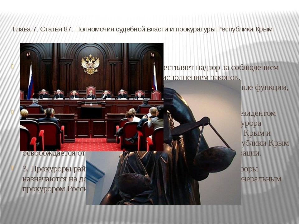 Анализируя полномочия прокуроров по проверке законности судебных решений и собранных по делу материалов, независимо от того, участвовали ли они в судебном разбирательстве, и могут опротестовать решения по уголовным, гражданским, экономическим и административным делам в вышестоящем суде, специальный докладчик заключает, что эти полномочия, представляющие собой рудимент правовой системы бывшего Советского Союза, нарушают принципы разделения властей и независимости судебной власти и создают значительные коррупционные риски с учётом иерархической структуры органов прокуратуры и того, что генеральный прокурор назначается политическими органами.