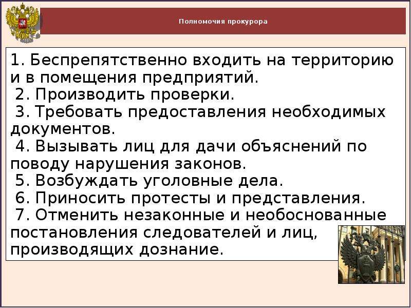 В рекомендациях указано, что полномочия прокуроров следует ограничить уголовной сферой (досудебное расследование и исполнение уголовного наказания). Следует рассмотреть вопрос о передаче широких надзорных полномочий, возложенных на сотрудников прокуратуры, другим госорганам, например, судебным органам, когда это целесообразно, или независимому национальному правозащитному учреждению. Полномочия прокуроров по истребованию дела или принесению протеста на решения суда следует отменить.