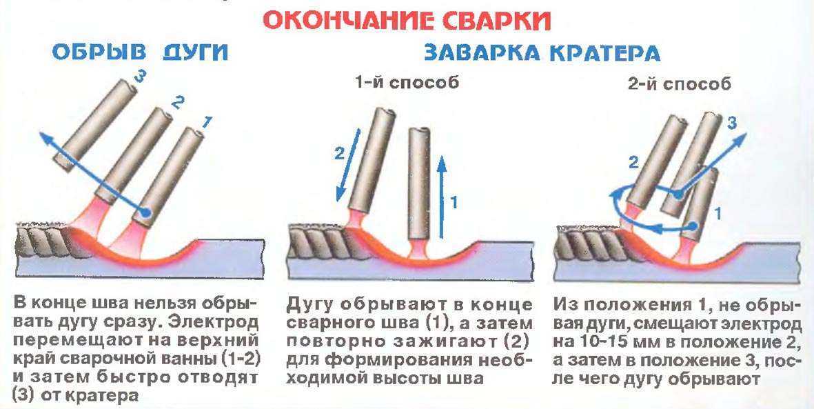 В конце шва не следует резко выключать сварочную дугу и отводить горелку от кратера. Особенно на толстых листах, где в объемных валиках могут возникать глубокие кратеры на конце шва, лучше медленно отвести дугу от ванны или, если применяемая система это позволяет, настроить программу заполнения кратера в конце шва. На большинстве систем можно также настроить время завершающей подачи защитного газа, чтобы последний участок еще жидкого наплавляемого металла мог застыть под защитой газа. Однако это имеет смысл, только если горелка еще некоторое время остается на конце шва.