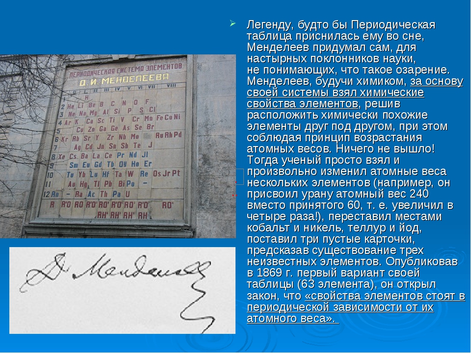Принято считать, что свою периодическую таблицу Менделеев увидел во сне, и ему оставалось лишь записать ее и обосновать.