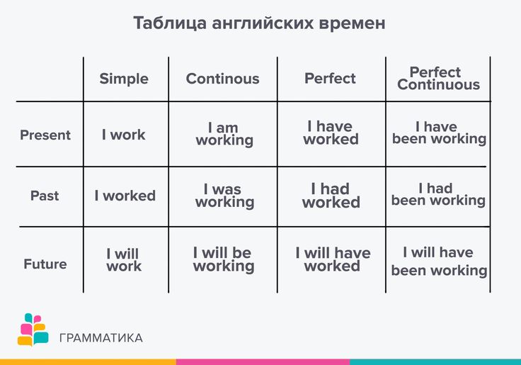 | Past | I worked (Я работал) | I was working (Я работал) | I had worked (Я работал) | I had been working (Я работал) |