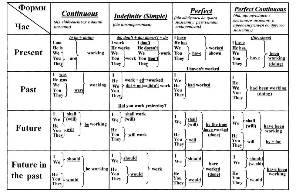 Сначала посмотрите на сводную таблицу английских времен. Это будет для вас как-бы шпаргалка, где на одном изображении собраны все данные по временам.