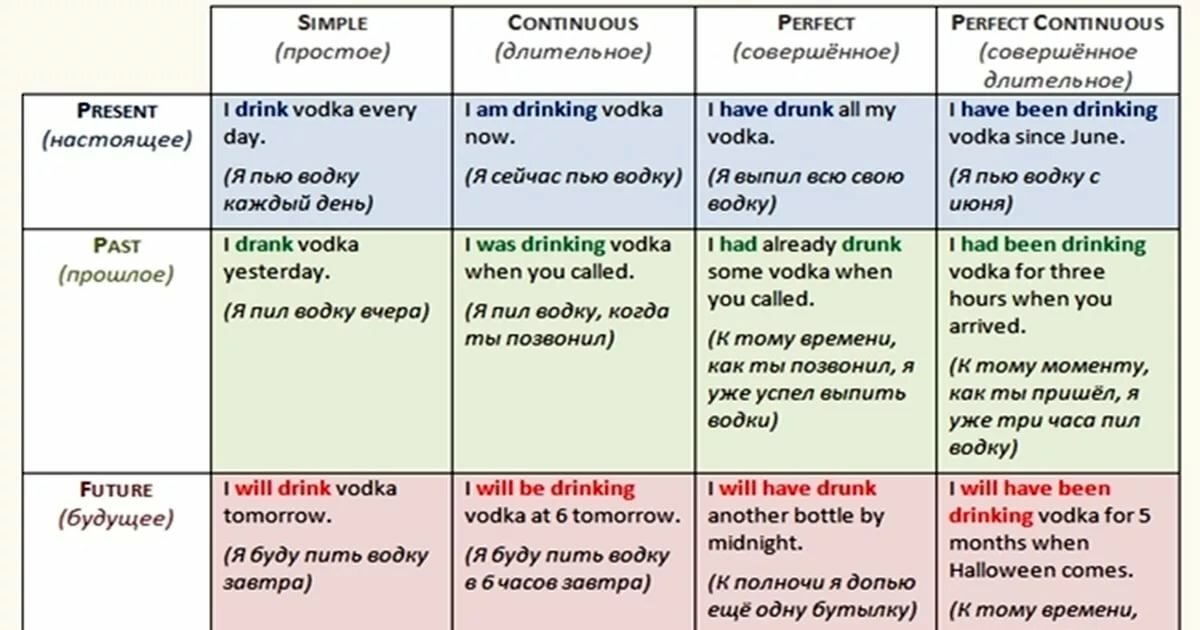 Стоит однако признать, что в интернете я нашел еще более совершенную таблицу, в которой указано абсолютно все: добавлены примеры на основе глагола to vodka (напиваться), добавлены схемы и отмечена “популярность” времен. Скачать ее можно тут.